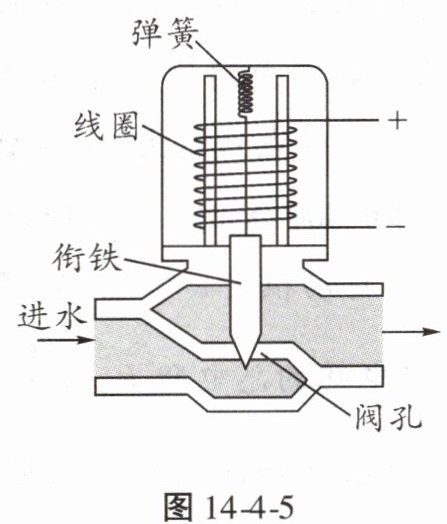1. 全自动洗衣机的进水阀门是由电磁铁控制的,其构造示意图如图14-4-5所示。线圈通电后产生磁场,对衔铁施加力的作用,使衔铁移动,阀孔打开,水流进洗衣机。下列关于线圈通电后的分析正确的是(