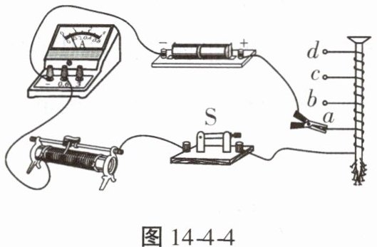 【典例3】把漆包线(表面涂有绝缘漆)绕在铁钉上做成有四个接线柱a、b、c、d的电磁铁,用夹子连接不同的接线柱,可改变线圈的匝数。将电磁铁和其他实验器材组成图14-4-4所示电路,用来探究影响电磁铁磁性强弱的因素。