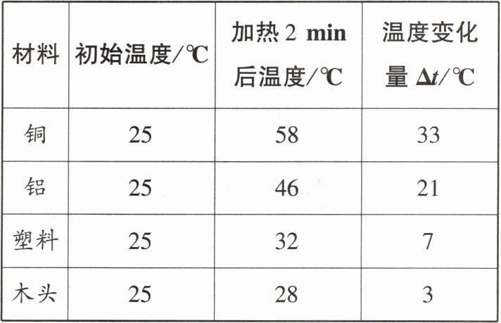 13. 小华发现家中不同材质的锅柄传热能力不同,猜想物体的传热能力可能与材料种类有关。他选取了铜片、铝片、塑料片和木片(表面积均为50 cm²)进行实验,用同一酒精灯加热材料一侧,用温度传感器记录材料另一侧的温度变化,数据记录如下表: