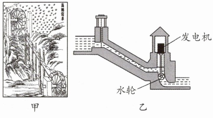 10. (古代科技)人类文明,一脉相传。从远古的高转筒车,到今天的水电站,都是人类对水能的开发与利用。图10-6-3甲是高转筒车,下方转轮安装在河道中,流水驱动轮子转动,系在传动绳索上的竹筒将水从河里源源不断地输送到上方农田中;图10-6-3乙是水电站,流水冲击水轮,带动发电机发电。下列说法正确的是(