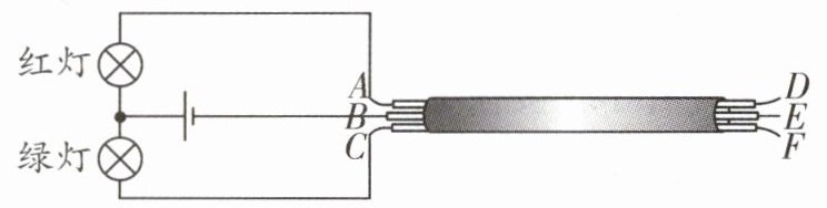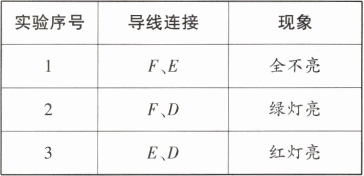 13. 如图11-1-14所示,在一根横跨河流两岸的硬塑料管内穿有三根完全相同的电线,为了辨别哪两个线头为同一根导线的两端,可以用图示方法测试,其操作过程如下:将两个颜色不同的小灯泡接入电路,分别用导线连接D、E、F,通过观察记录两灯发光情况,就可判断出所有导线的首尾。依据表格的记录情况,下列判断正确的是(