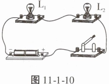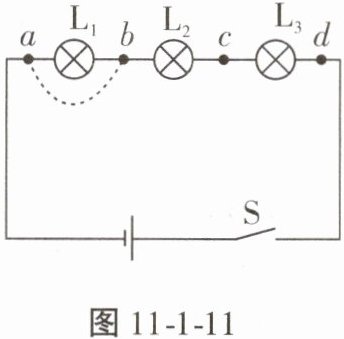 10. 如图11-1-11所示的电路中,电源电压不变,闭合开关,灯泡L₁、L₂、L₃都不发光。若只有一个灯泡的灯丝发生了断路,现用一根导线(如图中虚线所示)连接a、b点,三个灯泡仍都不亮,则(