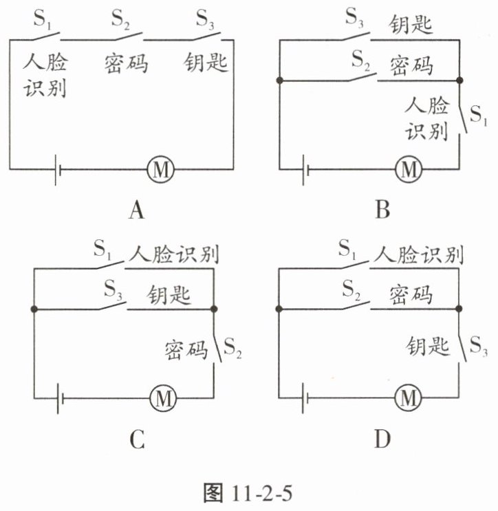 4. (2024湖南中考)科技小组模拟“智能开锁”设计的电路图,有两种开锁方式,即“人脸识别”与输入“密码”匹配成功,或“人脸识别”与使用“钥匙”匹配成功才可开锁。现用S₁表示人脸识别,S₂、S₃分别表示密码、钥匙,匹配成功后对应开关可自动闭合,电动机工作开锁。满足上述两种方式都能开锁的电路是图11-2-5中的(