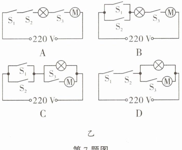 7. 图甲是小区内常见的售水机。居民购水时,先通过手机扫码(闭合 $ S_1 $)或投币(闭合 $ S_2 $)解锁售水机,此时照明灯亮起,接着按下出水按钮(闭合 $ S_3 $),启动电动机完成自动售水。如图乙所示的四个电路中,能满足上述功能的是(
