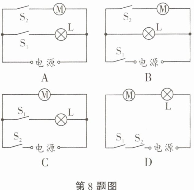 8. (2024 重庆中考)家用电动窗帘的电路主要由电源指示灯 $ L $ 和电动机 $ M $ 组成。先闭合开关 $ S_1 $,电源指示灯 $ L $ 亮;再闭合开关 $ S_2 $,电动机 $ M $ 工作拉动窗帘。当 $ S_1 $ 断开时,电动机 $ M $ 不能工作。如图所示电路中符合要求的是(