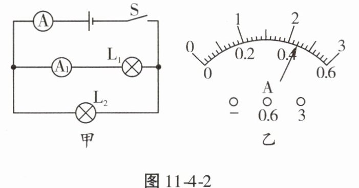 【典例3】如图11-4-2甲所示,开关闭合后,两个电流表指针偏转均如图11-4-2乙所示,则通过L₁和L₂的电流分别为(