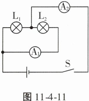 7. 如图11-4-11所示的电路,当开关S闭合后,电流表A₁、A₂的示数之比是3:5,则通过灯L₁和L₂的电流之比为(