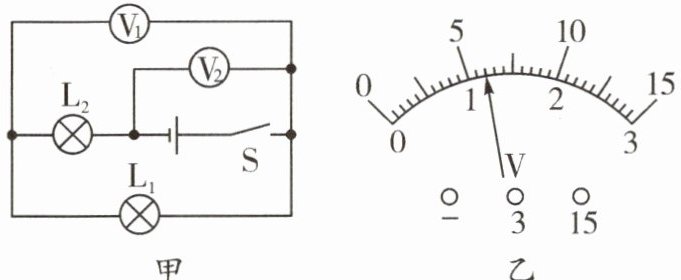 6. 小明按图 11 - 5 - 10 甲所示的电路进行实验,闭合开关 S 后两灯都正常发光,两个电压表指针在表盘上所指的位置完全一样,如图 11 - 5 - 10 乙所示,则下列说法正确的是(