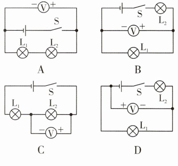 4. 如图 11 - 5 - 8 所示电路中,闭合开关,电压表测灯 L₁ 两端电压的是(