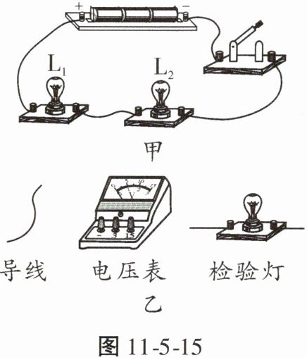 11. 实验课上,小明把两个小灯泡连成了图 11 - 5 - 15 甲所示的电路。闭合开关,两灯均不亮。经检查,电路连接无误,老师告诉他是其中一个小灯泡坏了。于是,小明又找来了一个小灯泡,想出了表格中方法一的检测方法。请你帮助小明,在不拆原电路的基础上,从图 11 - 5 - 15 乙所示的实验器材中任选一种,连入电路,设计出另外两种检测方法,并填入表中。