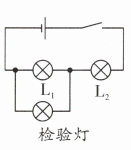 |闭合开关,若检验灯亮,则 L₁ 是坏的;若检验灯不亮,则 L₂ 是坏的|