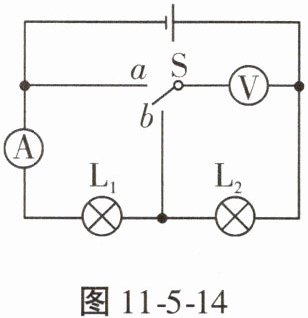 10. 如图 11 - 5 - 14 所示的电路,电源电压保持不变。当开关 S 接到 a 时,电压表示数为 9 V;当开关 S 接到 b 时,电压表示数为 5 V,电流表的示数为 0.4 A,则电源电压是
