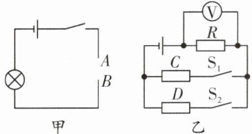 拓展创新:小明在查阅资料时发现矿泉水中含有多种矿物质,导电能力强,电阻小;纯净水导电能力弱,电阻大。他为了验证这个结论,将等质量的两种水分别灌入两个相同的玻璃管$C$、$D$中,并将玻璃管$C$、$D$连入图 12 - 2 - 1 乙所示的电路。先将开关$S_{1}$闭合,观察电压表示数。再将$S_{1}$断开,$S_{2}$闭合,若电压表示数变大,则玻璃管