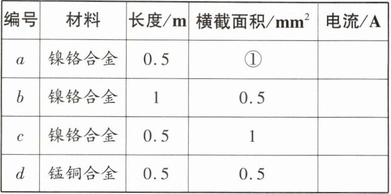 实验过程:(1)小明找到了$a$、$b$、$c$、$d$四根电阻丝,为了能够完成探究,他设计了下面的记录表。请将表中①处补充完整: