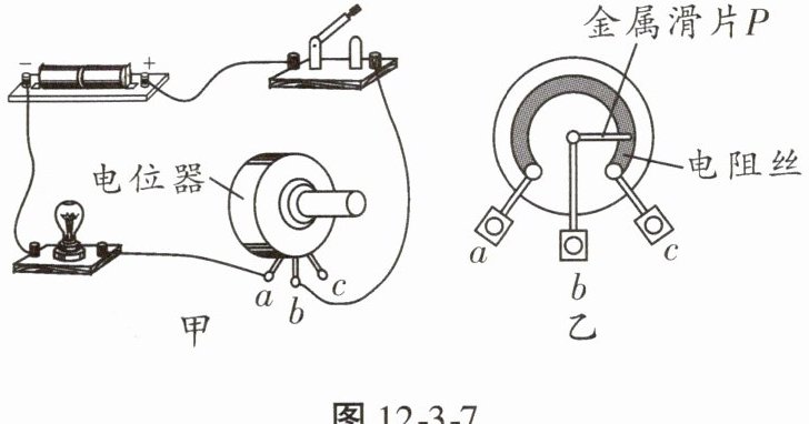 9. 小华用电池组、小灯泡、电位器、导线和开关组成了一个调光电路,如图12-3-7甲所示。如图12-3-7乙所示是电位器的内部构造示意图。闭合开关后,电位器的