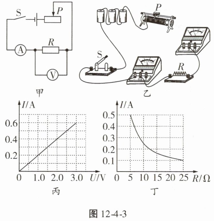 。(3)小芳在探究“电流与电阻的关系”的实验中多次改变定值电阻的阻值,调节滑动变阻器的滑片,使电压表示数保持不变,记下电流表的示数,得到图12-4-3丁所示的电流I随电阻R变化的图像。