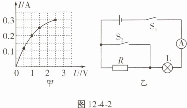 【典例3】小灯泡的I-U图像如图12-4-2甲所示,将它与定值电阻R接入图12-4-2乙所示的电路中。只闭合开关S₁时,电流表的示数为0.2 A;再闭合开关S₂时,电流表的示数为0.3 A,则电源电压为