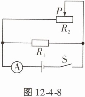 8.(2024 内江中考)如图12-4-8所示的电路中,电源电压恒为12 V,定值电阻R₁的阻值为5 Ω,滑动变阻器R₂上标有“50 Ω 2 A”的字样,电流表的量程为0~3 A。闭合开关S,滑动变阻器的滑片P从最右端(R₂ = 50 Ω)移动到连入电路中的电阻值为20 Ω处,电流表的示数从I变为I',则I'与I之差为(