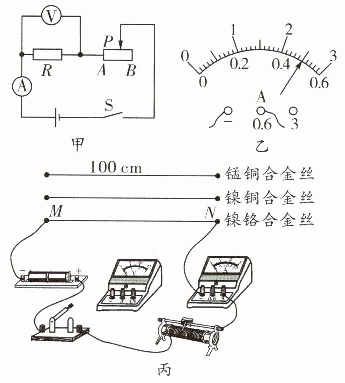 (选填“减小误差”或“寻找普遍规律”)。(4)小明要进一步测量长度为100cm的镍铬合金丝MN的阻值,器材如图12-5-13丙所示。其中导线只有7根,且长度均为30cm。请根据实际操作需要,用笔画线代替剩余2根导线,在图丙中将实物电路示意图补充完整(实物图中导线及电阻丝长度未按照比例绘制)。要求:导线两端只能接在各电路元件的接线柱上。