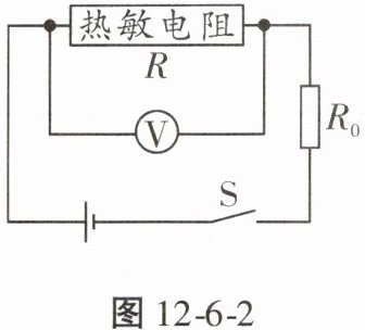 【典例2】有一种半导体材料的电阻随着温度的变化情况如下表所示。用这种材料制成的热敏电阻$R$与电压表等元件连成图12-6-2所示电路,电源电压为$6\ V$,电压表量程为$0\sim3\ V$,$R_{0}$阻值为$500\ \Omega$。若把电压表的刻度盘改为表示水温的刻度盘,则下列说法正确的是(