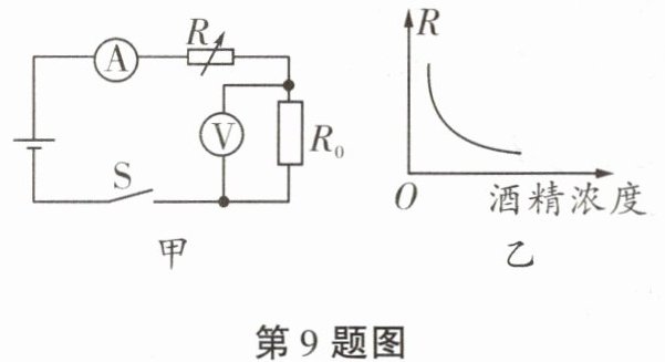 9. 喝酒不开车,开车不喝酒。酒驾危害公共安全,我国已经立法禁止。如图甲所示是酒精浓度监测仪的原理图,电源电压不变,$R_0$为定值电阻,$R$为酒精气体传感器,其阻值与酒精浓度的变化关系如图乙所示。接通电源,当驾驶员呼出的酒精浓度变大时,电流表示数