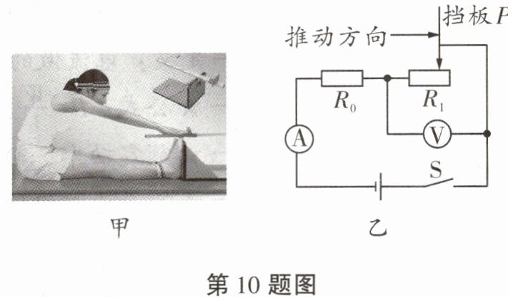 10. (2024泰州中考)如图甲所示是进行“坐位体前屈”体质测试的情境。小华所在项目化学习小组设计了一个功能相似的测试模型,其原理电路如图乙所示,电源电压为$6V$不变,$R_0$的阻值为$30\Omega$,电阻$R_1$用总长为$30cm$、粗细均匀的电阻丝制成(其电阻与长度成正比),挡板初始位置在$R_1$最左端。闭合开关,向右推动挡板的过程中,电流表示数