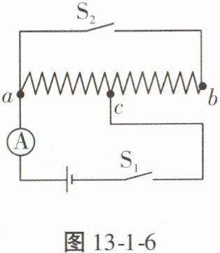 6. (2025天津中考)如图13-1-6所示的电路,电源电压恒为3 V,a、b是粗细均匀的电阻丝的两端点,c是电阻丝的中点。只闭合开关S₁,电流表示数为1 A,该电路通电1 min消耗的电能为