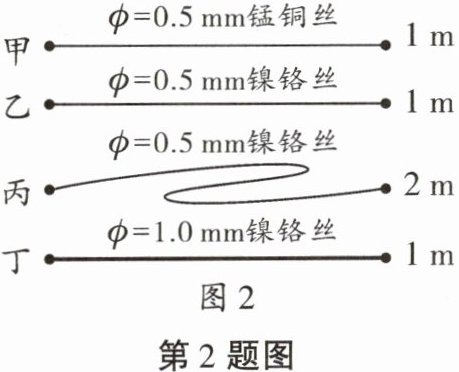 2. 在“探究影响导体电阻大小的因素”实验中,分别将图2中甲、乙、丙、丁四根电阻丝接入图1中$M$、$N$之间进行探究。