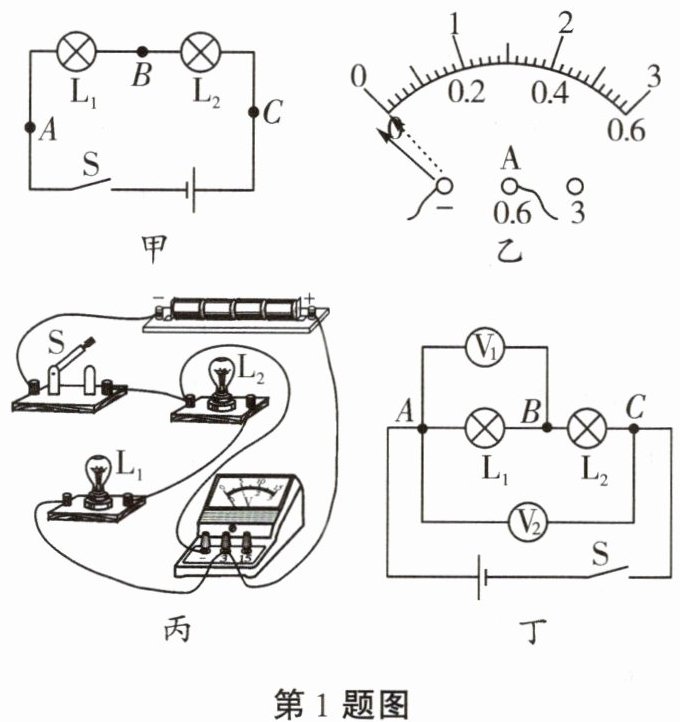 。(2) 如图丁所示电路,闭合开关后,发现电压表$V_{1}$和$V_{2}$的指针偏转角度相同。电压表本身没有问题,则可能的原因是电压表
