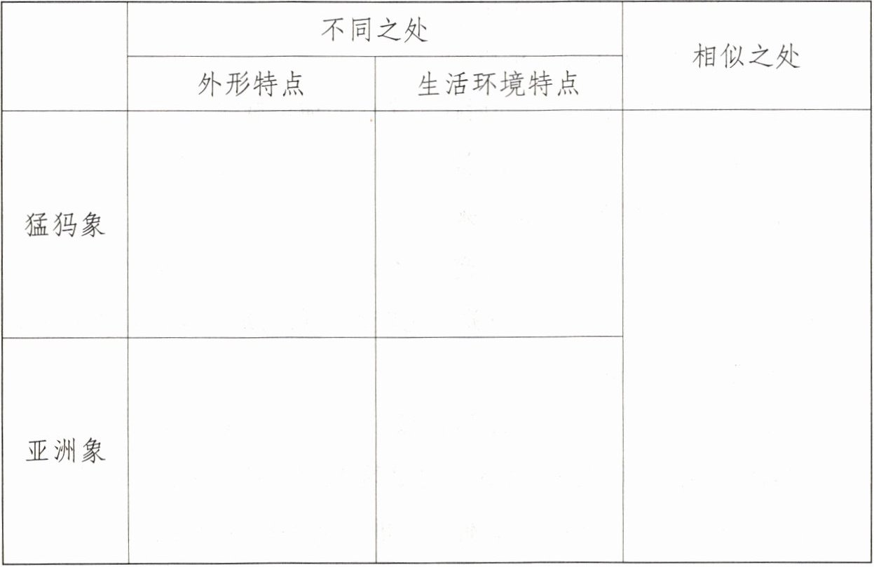 四、查阅资料,比较猛犸象和亚洲象,将查到的信息进行归纳并记录在下列表格中。