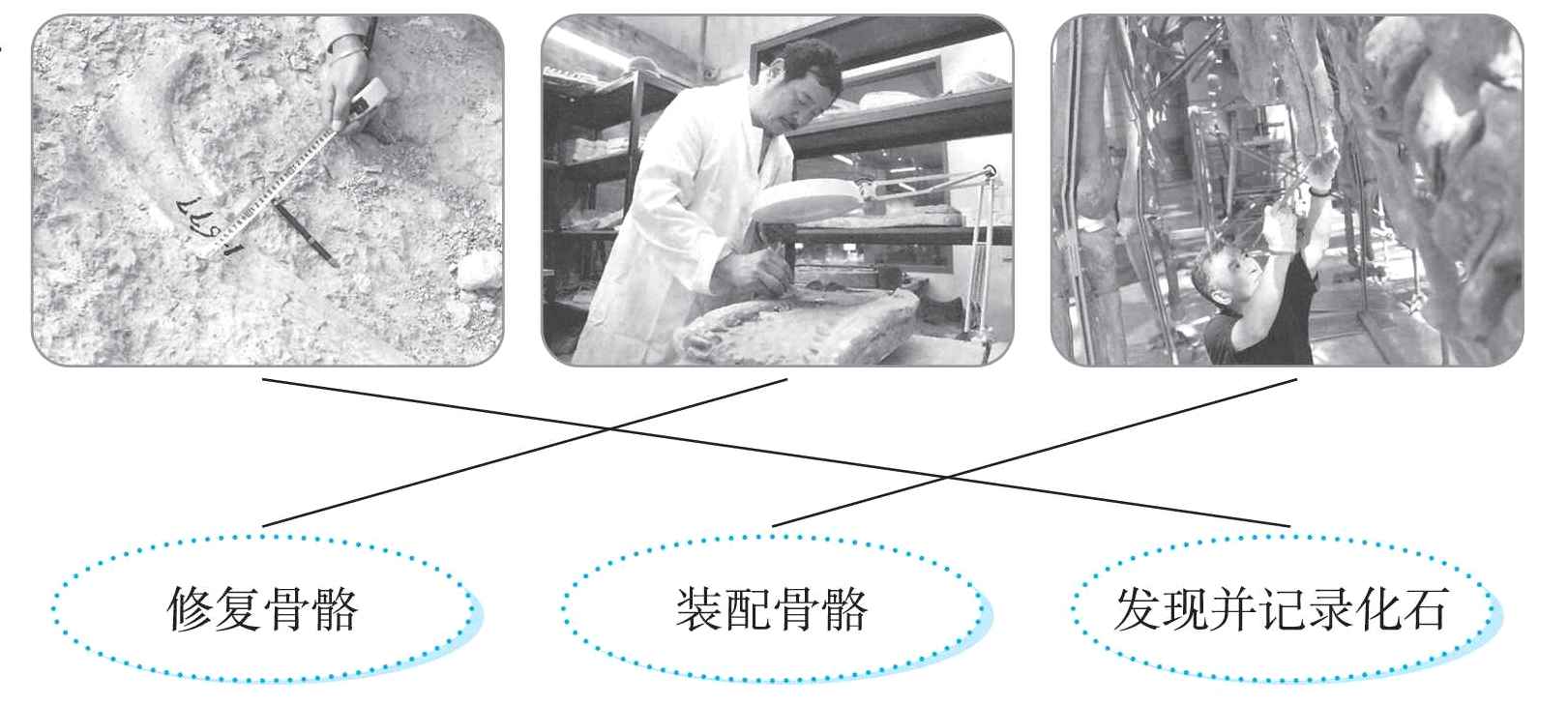 三、为了研究恐龙,科学家正在做什么?请连线。