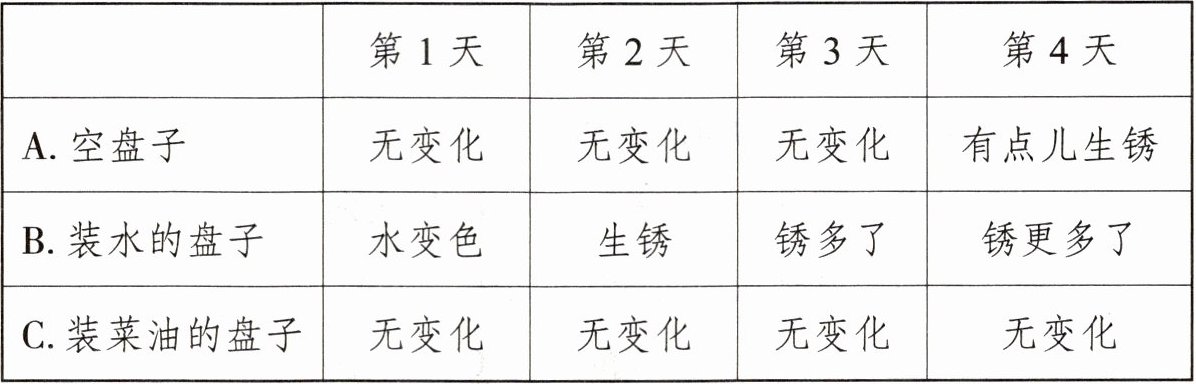 | B. 装水的盘子 | 水变色 | 生锈 | 锈多了 | 锈更多了 |