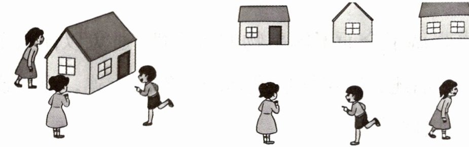 2. 三个小朋友分别看到的是房子的哪一面?连一连。