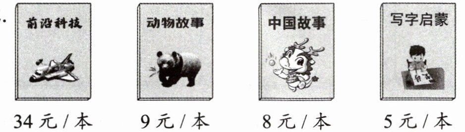 因为《写字启蒙》$5$元一本,《动物故事》$9$元一本,$3×5$表示买$3$本《写字启蒙》的价钱,$34$是《前沿科技》的单价。