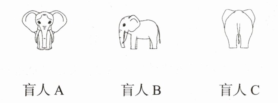 2. “盲人摸象”的故事强调了全面了解事物的重要性,避免以偏概全。根据下面三个盲人的描述,确定他们摸到的大象的位置,连一连。