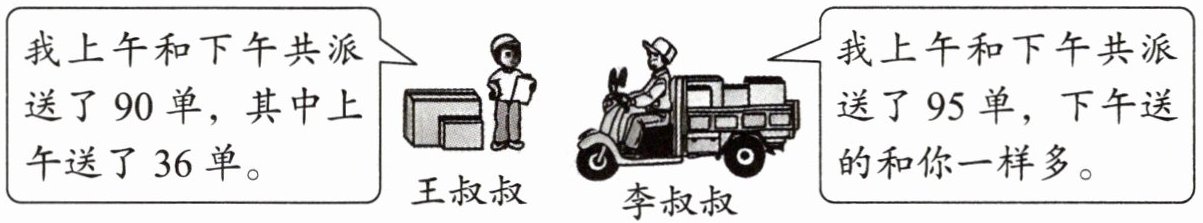 1. 王叔叔和李叔叔派送快递,根据下列对话信息,李叔叔上午派送了多少单快递?