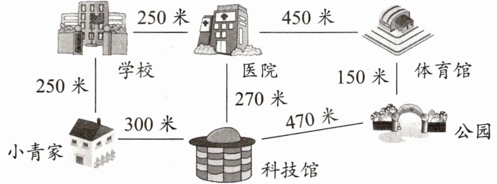 3. 从学校到公园怎么走最近?要走多少米?把最近的路线描出来。