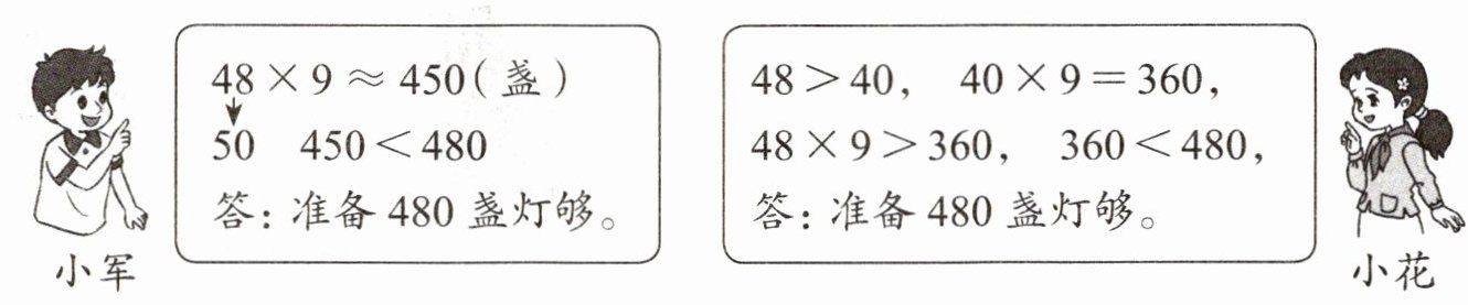 2. 学校有48间教室,每间教室装9盏灯,准备480盏灯够吗?你认为谁的方法解决这个问题更合适?请说明理由。