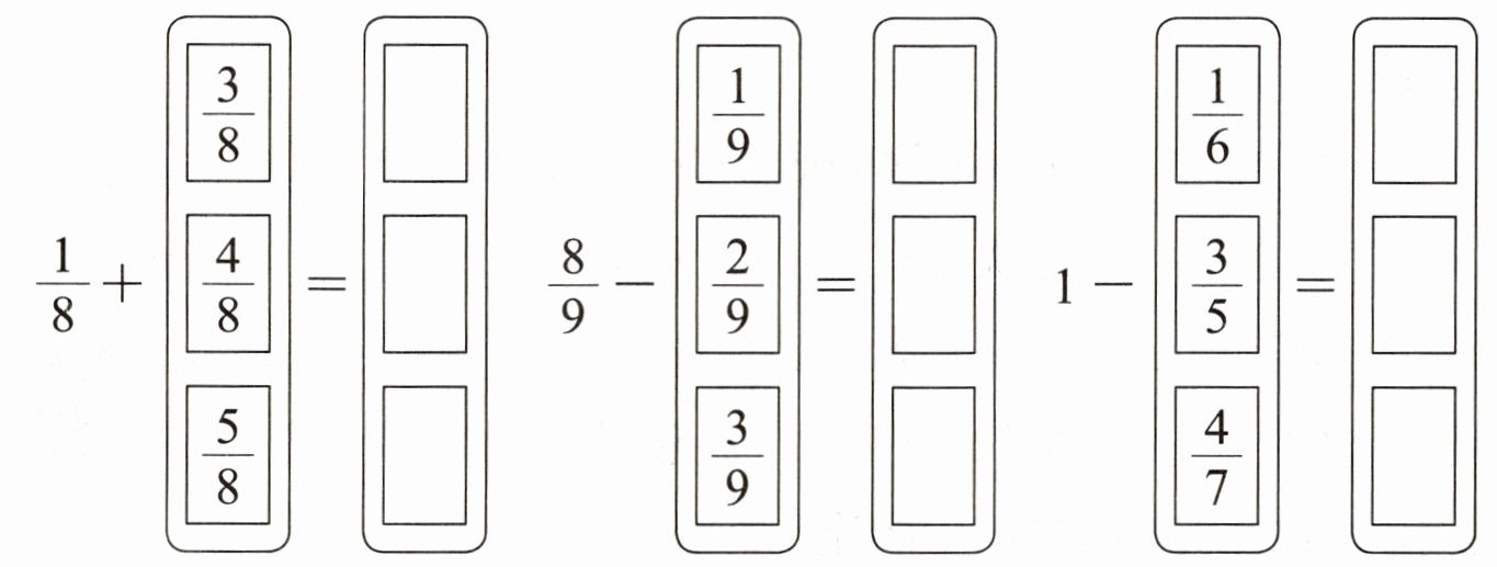 $\begin{array}{ll}\frac{(\quad)}{7}+\frac{(\quad)}{7}=\frac{6}{7} & \frac{(\quad)}{10}-\frac{(\quad)}{10}=\frac{1}{10} \frac{(\quad)}{6}+\frac{(\quad)}{6}>\frac{2}{6} & \frac{(\quad)}{5}+\frac{(\quad)}{5}<1\end{array}$
