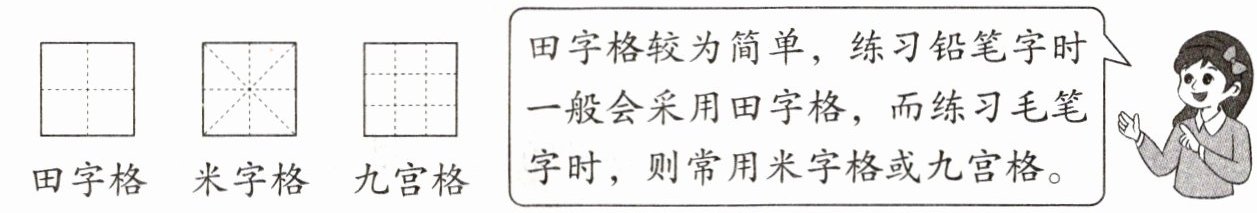 3. 采用习字格临帖是练习书法的一种方法。如图所示,常用的习字格有田字格、米字格、九宫格等。(格中的虚线一般被称为辅助线)