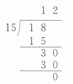 $ \begin{array}{r} 12 \\ 15 \enclose{longdiv}{18} \\ 15 \\ \hline 30 \\ 30 \\ \hline 0 \end{array} $