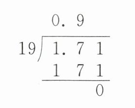 $ \begin{array}{r} 0.9 \\ 19 \enclose{longdiv}{1.71} \\ 171 \\ \hline 0 \end{array} $