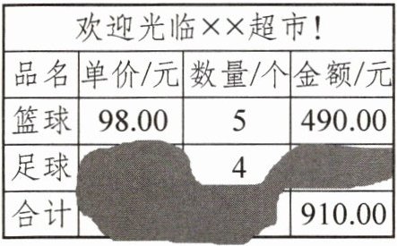 3. 向老师买体育用品的购物小票污损了,你能算出每个足球多少钱吗?(列方程解答)