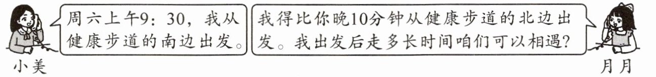 小美周六上午9:30,我从健康步道的南边出发。我得比你晚10分钟从健康步道的北边出发。我出发后走多长时间咱们可以相遇?