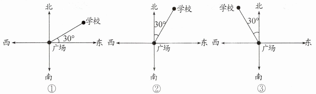 1. 以广场为观测点,学校在广场北偏西 $30^{\circ}$ 的方向上,下图中表示正确的是( )。