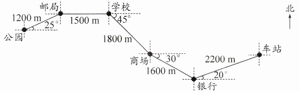 $8$ 路公共汽车从公园出发,向( )偏( )$25^{\circ}$ 的方向行驶( )$m$ 到达邮局,再向( )行驶( )$m$ 到达学校,又向( )偏( )$45^{\circ}$ 的方向行驶( )$m$ 到达商场。由商场向东偏( )( )$^{\circ}$ 的方向行驶( )$m$ 到达银行,再向东偏( )( )$^{\circ}$ 的方向行驶( )$m$ 到达车站。