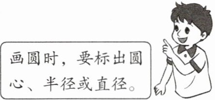 旋转圆规一周,画出圆,标出圆心$O$和直径$d = 3\mathrm{c}\mathrm{m}$(或标出半径$r = 1.5\mathrm{c}\mathrm{m}$)。