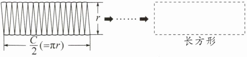 (1)把一个圆分成若干等份,可以拼成一个近似的长方形。这个长方形的长相当于圆的( ),宽相当于圆的( ),因此圆的面积计算公式用字母表示是 $ S = $ ( )。