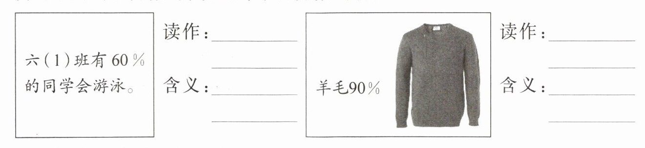 4.读作:百分之六十,表示会游泳的学生人数占全班人数的60%;读作:百分之九十,表示羊毛含量占整件衣服材质的90%