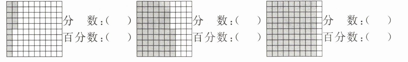 2. 下面的每个小正方形表示“1”,把下面各图中阴影部分用分数和百分数表示出来。